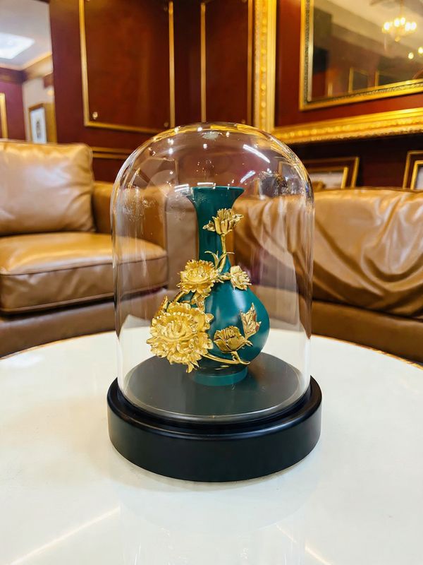 Bình được đặt trên đế gỗ cao cấp, thiết kế tròn chắc chắn, bề mặt mịn, giúp sản phẩm đứng vững và tách biệt khỏi bề mặt trưng bày. Phía ngoài là lớp mica trong suốt hình vòm, bảo vệ sản phẩm khỏi bụi bẩn, va chạm nhẹ, đồng thời giúp giữ trọn vẻ đẹp nguyên bản của bình khi trưng bày lâu dài.