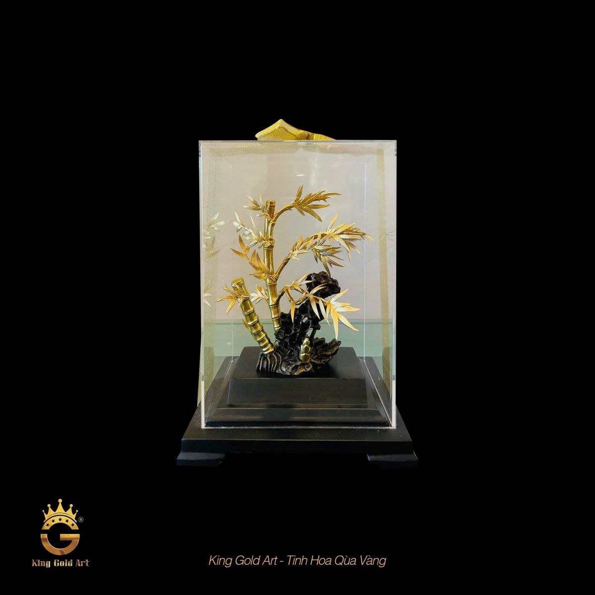 Cây Trúc Dát Vàng 24K của thương hiệu King Gold Art được chế tác từ chất liệu đồng cao cấp, bề mặt được dát vàng 24K tinh xảo, thể hiện rõ nét từng đốt trúc, cành lá uyển chuyển, mềm mại. Toàn bộ sản phẩm được đặt trên đế gỗ đen sang trọng, bao phủ trong hộp mica trong suốt có nơ trang trí, giúp sản phẩm luôn nổi bật và giữ được độ bền cao theo thời gian.