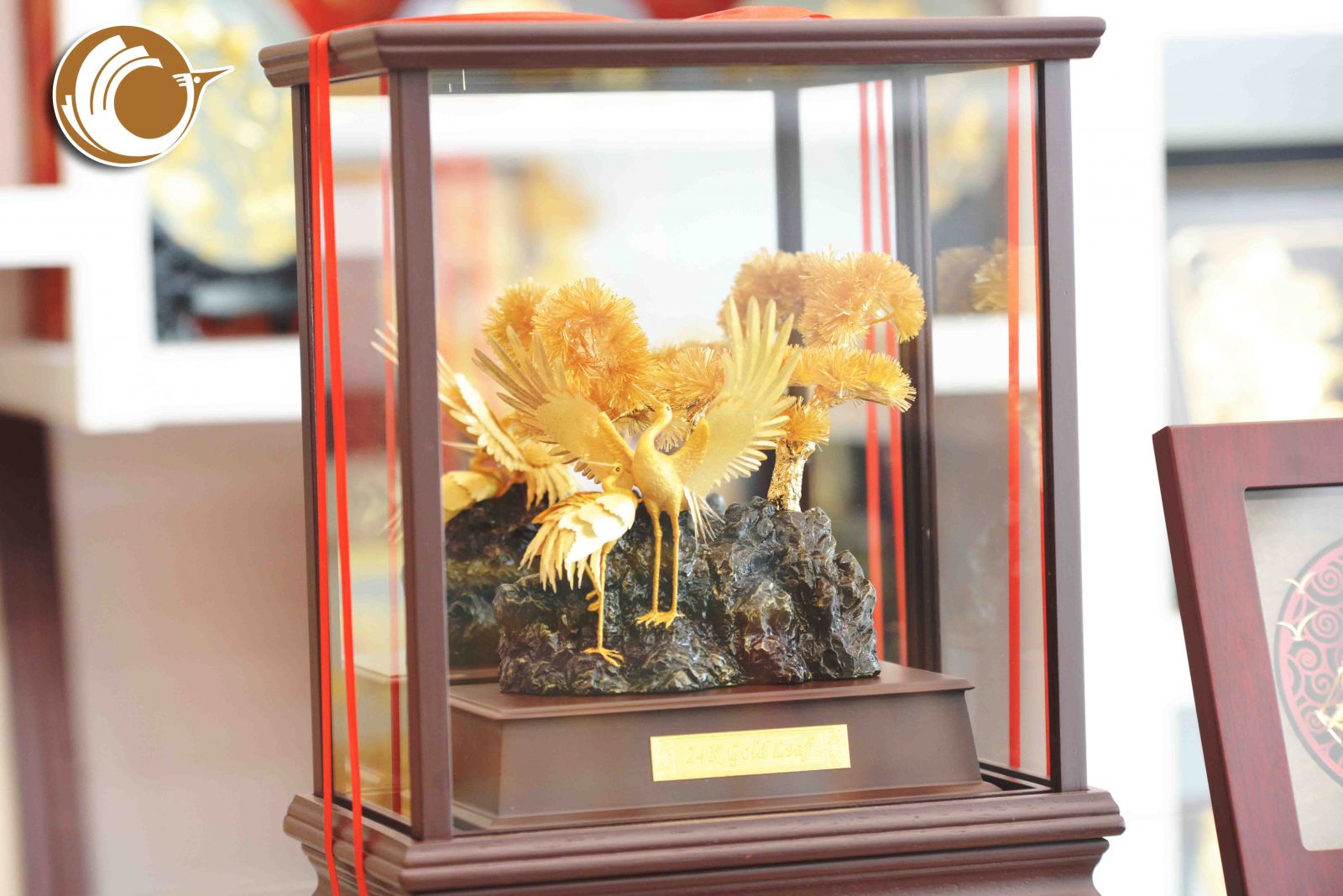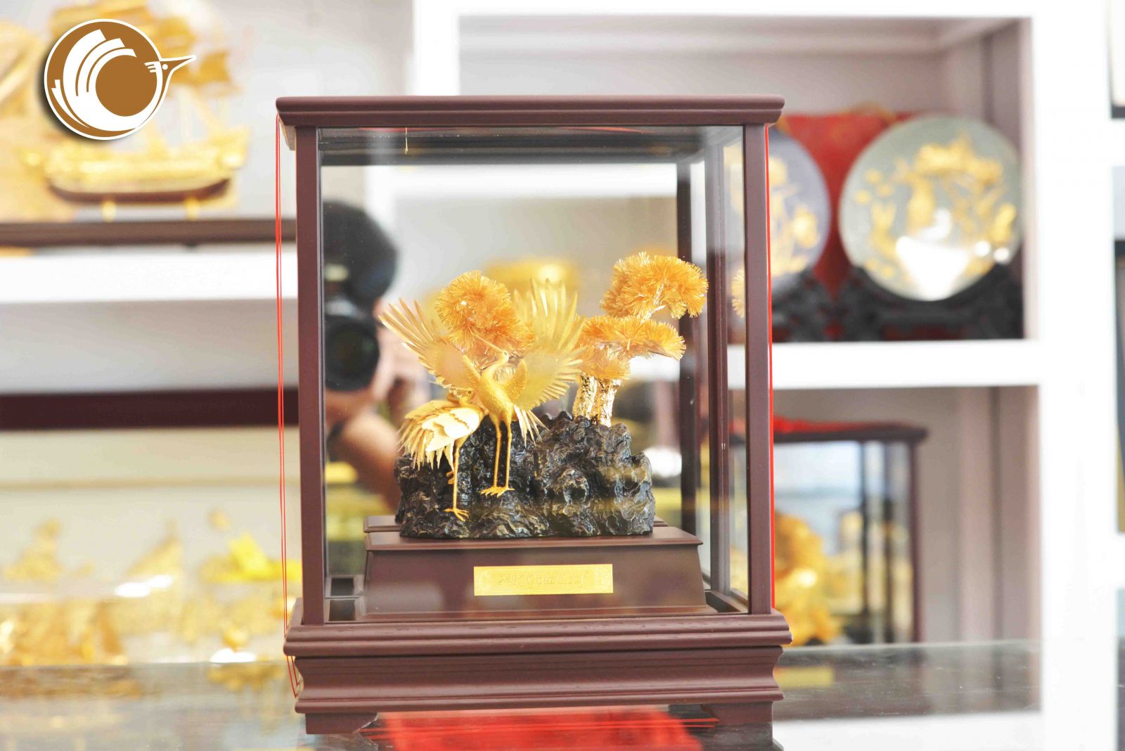 Tác phẩm chim hạc đồng mạ vàng được chế tác từ đồng nguyên chất, sau đó được dát vàng 24K để tăng tính thẩm mỹ và giá trị. Mỗi chi tiết từ cánh chim, lông vũ cho tới phần đế núi giả đều được chạm khắc công phu, tái hiện hình ảnh chim hạc uyển chuyển giữa thiên nhiên sống động.