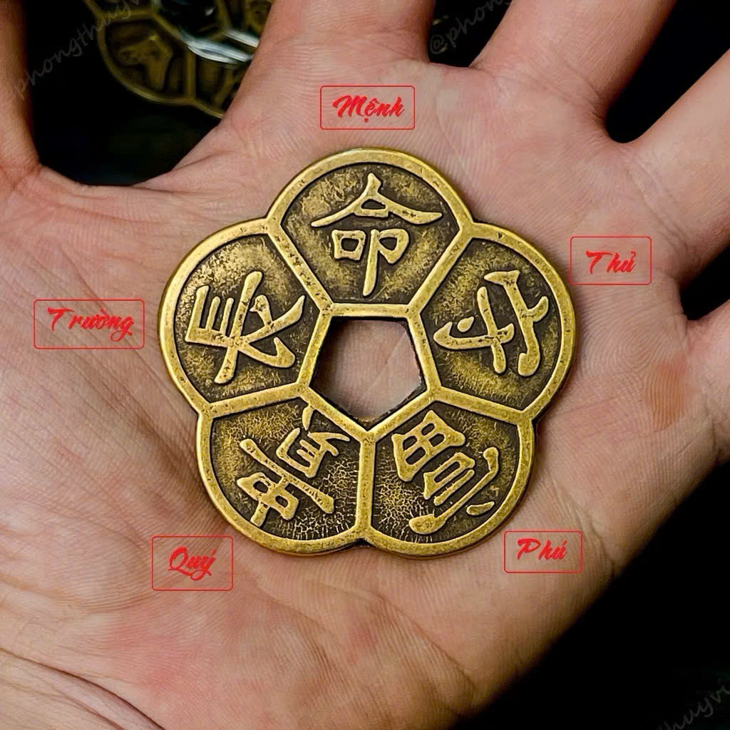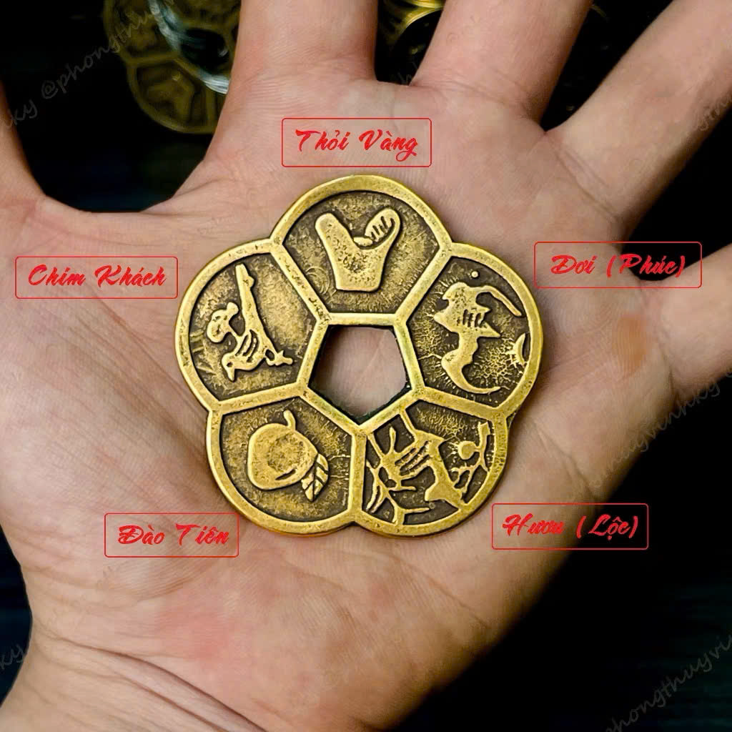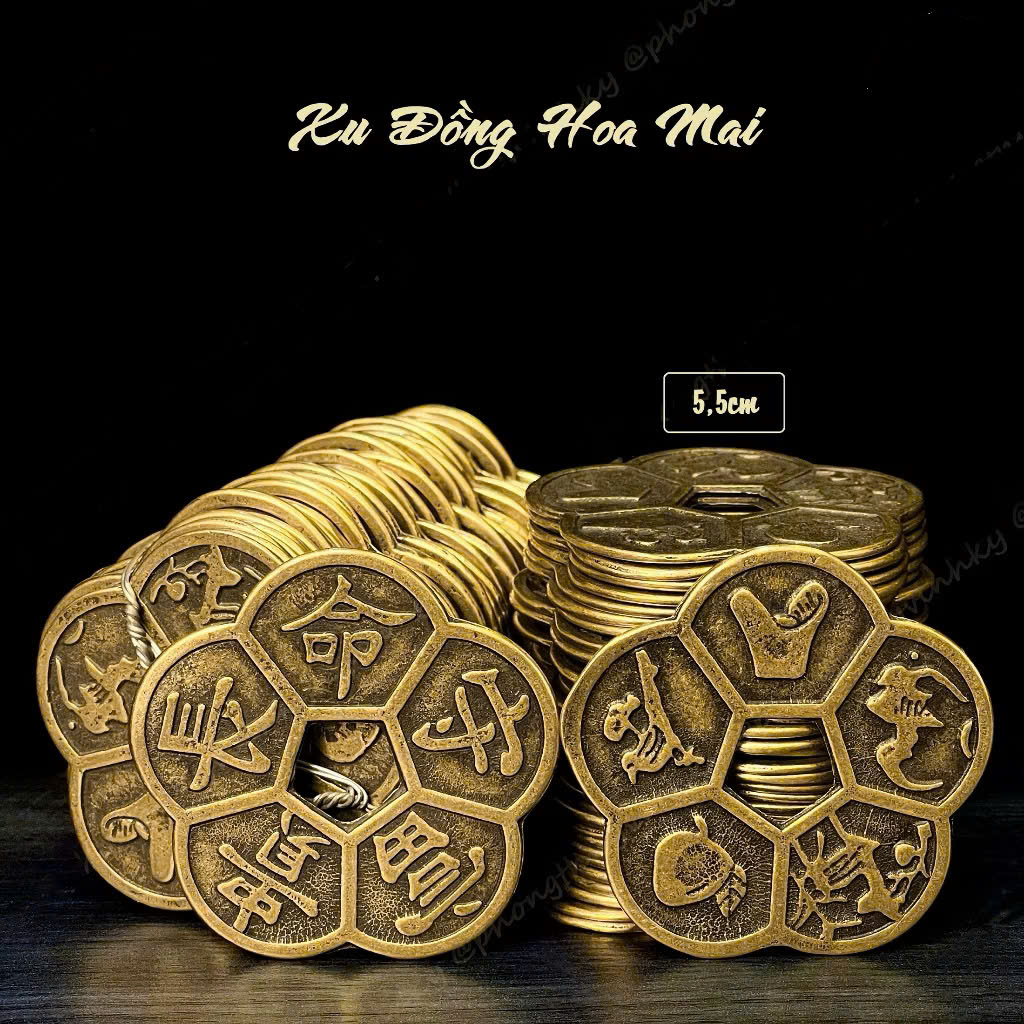 Hoa mai năm cánh tượng trưng cho ngũ phúc: Phú – Quý – Thọ – Khang – Ninh. Các mặt kim tiền cổ đại tượng trưng cho tài lộc lưu thông, kinh doanh thuận lợi. Khi kết hợp, xu phong thủy may mắn mang ý nghĩa khai vận đầu năm, thu hút tài khí, gia tăng vượng khí cho gia chủ và doanh nghiệp.