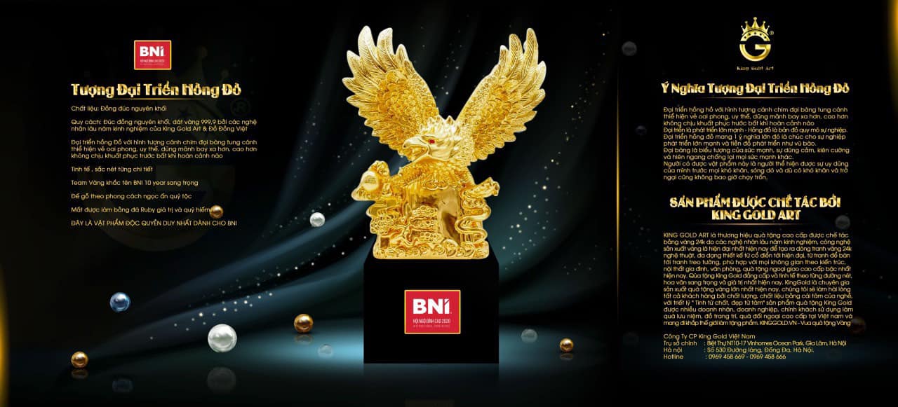 King Gold Art là một trong những thương hiệu nổi bật trong lĩnh vực sản xuất các sản phẩm tượng nghệ thuật, đặc biệt là tượng đại bàng mạ vàng và tượng đại bàng dát vàng. Các sản phẩm của King Gold Art luôn được chế tác từ các chất liệu cao cấp, với sự tỉ mỉ trong từng chi tiết. Các mẫu tượng đại bàng từ thương hiệu này không chỉ thể hiện vẻ đẹp nghệ thuật mà còn mang lại nhiều giá trị phong thủy cho người sở hữu.