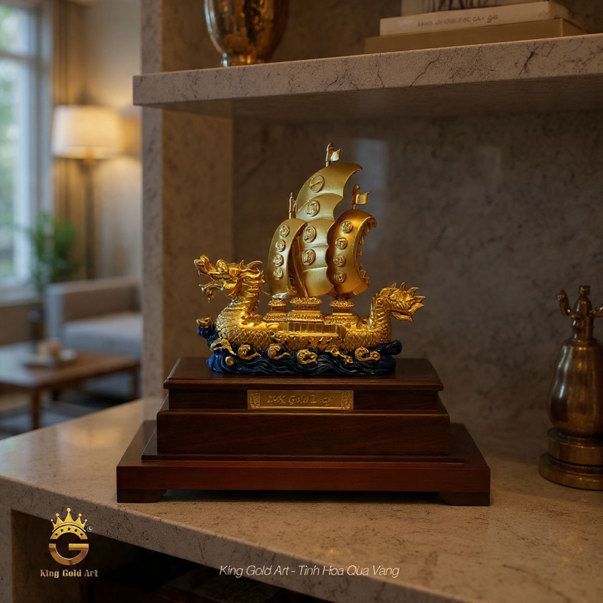 Sự kết hợp giữa sắc vàng kim và tông xanh sâu của sóng biển tạo nên tổng thể hài hòa, quyền uy và thanh lịch. mô hình thuyền rồng phong thủy có thể trưng bày trang trọng tại phòng khách biệt thự, phòng làm việc lãnh đạo hoặc sảnh tiếp khách doanh nghiệp.