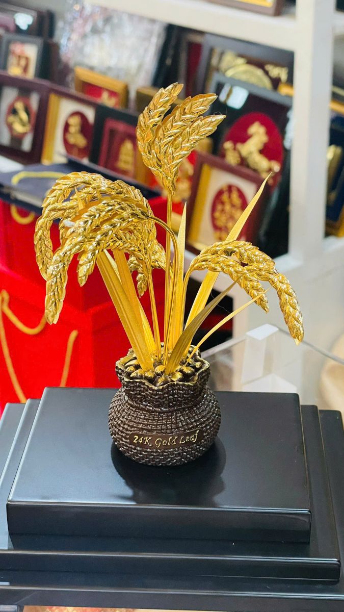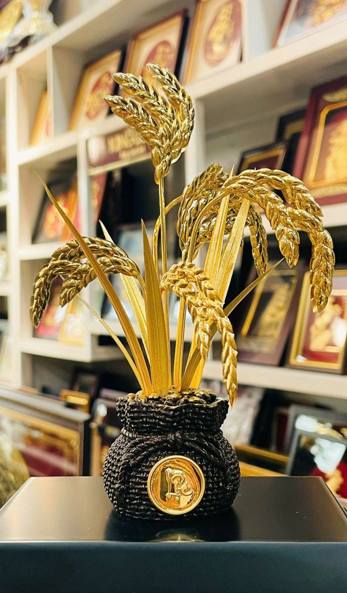 Tượng lúa vàng mạ vàng 24K mang phong cách sang trọng và tinh tế, phù hợp với nhiều không gian khác nhau như phòng khách, phòng làm việc hoặc tủ trưng bày.