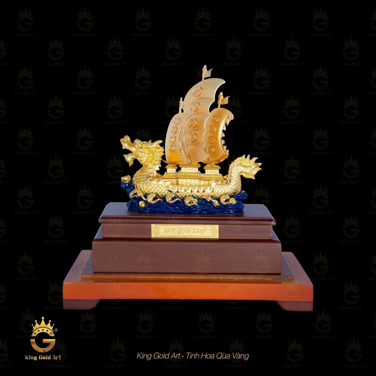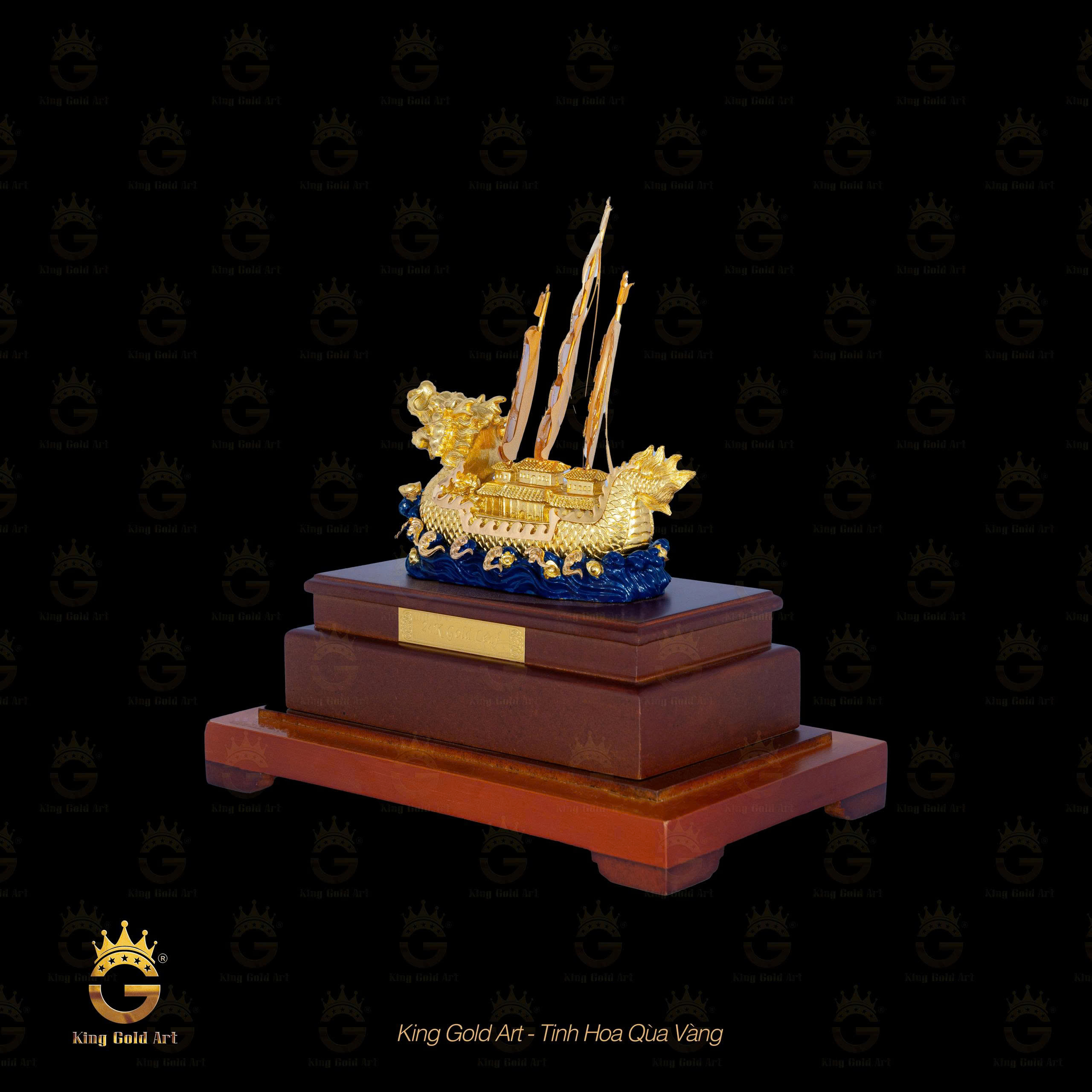 Khách hàng có thể đặt mô hình thuyền vàng thuận buồm xuôi gió theo thiết kế riêng, in logo, khắc tên công ty, thông điệp tri ân hay ngày kỷ niệm lên đế sản phẩm. Đây là một trong những điểm đặc biệt giúp King Gold Art chạm đến trái tim người nhận thông qua từng chi tiết nhỏ nhất.
