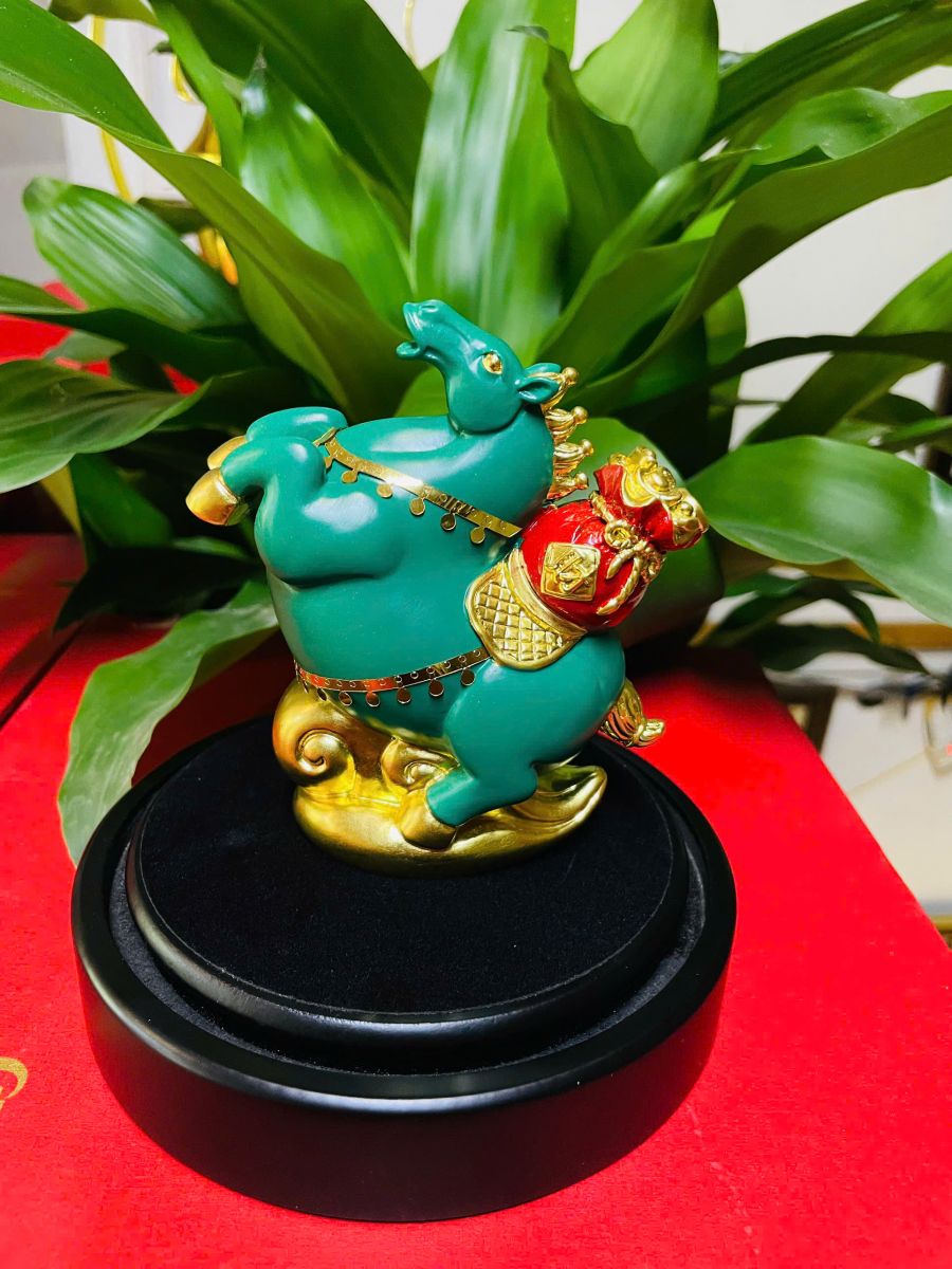 Màu xanh ngọc lục bảo không chỉ tạo ấn tượng sang trọng mà còn mang ý nghĩa ngũ hành thuộc Mộc – nuôi dưỡng năng lượng tích cực, giúp công việc hanh thông, mọi sự như ý. Kết hợp cùng các chi tiết mạ vàng thủ công tinh xảo, tượng toát lên vượng khí vững vàng, thích hợp với người làm kinh doanh, chính trị hay quản lý cấp cao.
