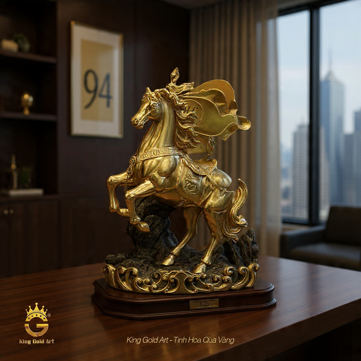 Quy trình chế tác tại King Gold Art được kiểm soát nghiêm ngặt từ khâu tạo mẫu, đúc đồng, xử lý bề mặt đến mạ vàng và hoàn thiện thủ công. Mỗi đường nét cơ bắp, từng nếp gấp trên lá cờ, từng chuyển động của bờm ngựa đều được trau chuốt kỹ lưỡng, tạo nên một tổng thể hài hòa, sống động và đầy khí thế.
