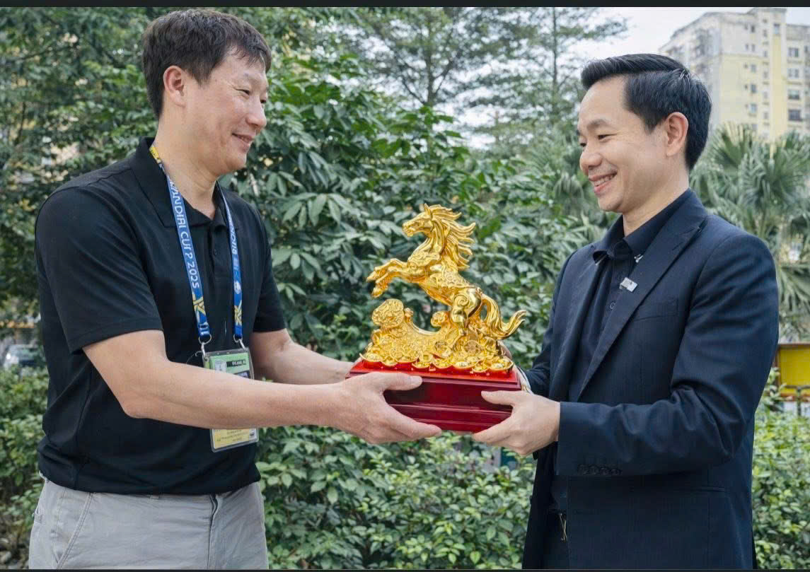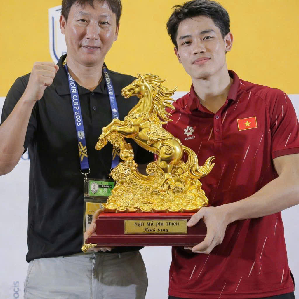 Trong không khí sôi động và đầy cảm xúc của trận bán kết, hình ảnh Huấn luyện viên trưởng Kim Sang-sik cùng cầu thủ Nguyễn Đình Bắc đón nhận tác phẩm Nhất Mã Phi Thiên mạ vàng 24K do King Gold Art chế tác mang ý nghĩa vô cùng thiêng liêng. Đây không chỉ là một món quà lưu niệm, mà còn là biểu trưng cho tinh thần chiến đấu, khát vọng vươn cao và niềm tin chiến thắng của đội tuyển bóng đá quốc gia Việt Nam.