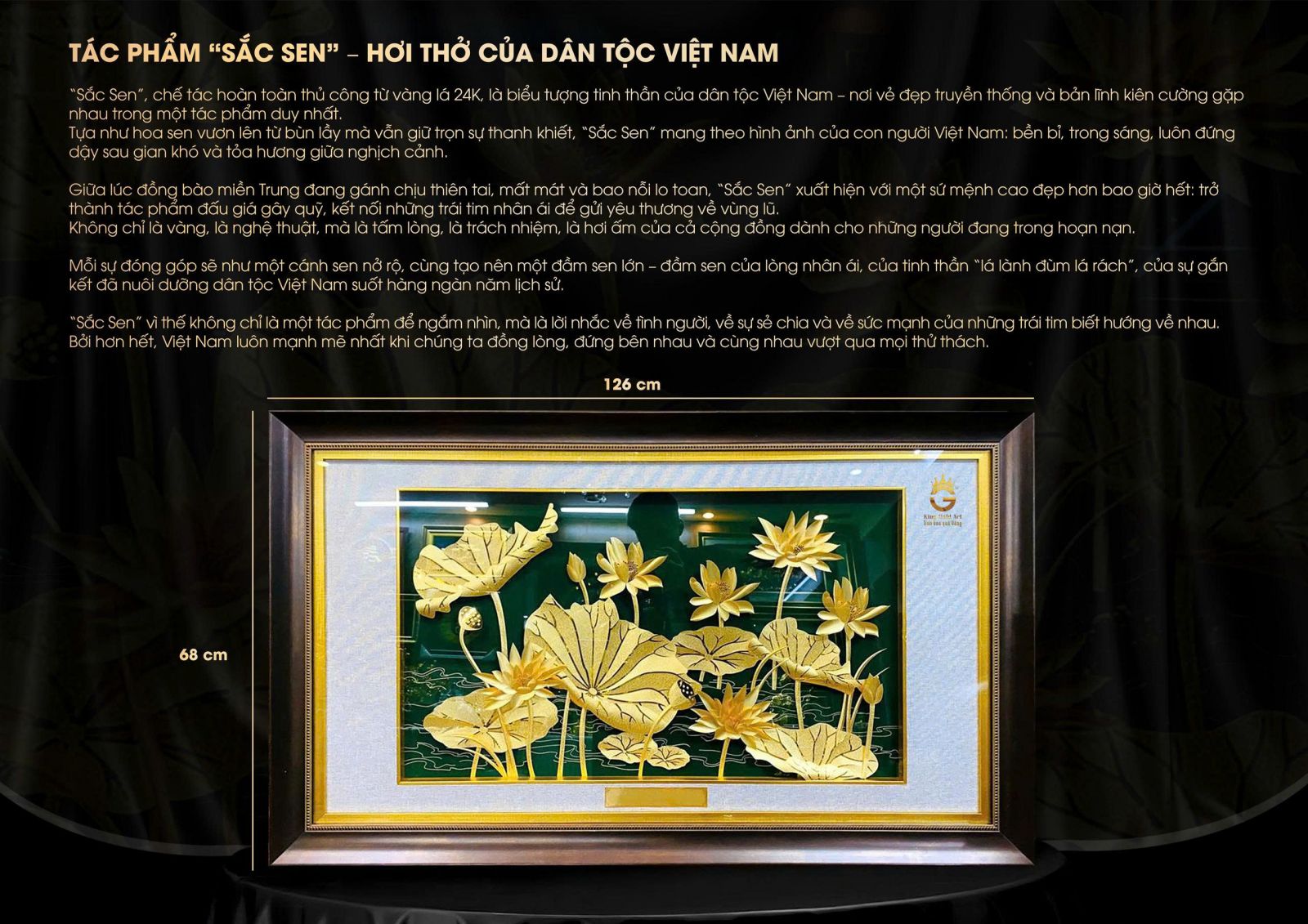 Với kích thước 126 x 68cm, bức tranh phù hợp trưng bày tại nhiều không gian sang trọng như phòng khách, phòng họp, sảnh lớn hay văn phòng doanh nghiệp. Tuy nhiên, giá trị lớn nhất của tác phẩm nằm ở ý nghĩa tinh thần và thông điệp mà nó đại diện.