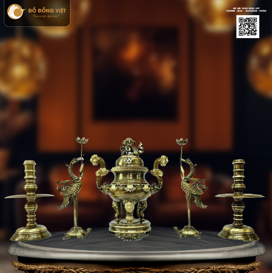 Bộ ngũ sự đồng: Gồm đỉnh đồng, đôi hạc đồng, và đôi chân nến đồng, tượng trưng cho sự đầy đủ, thịnh vượng và cân bằng phong thủy. Bộ ngũ sự mạ vàng là lựa chọn cao cấp, phù hợp với các gia đình muốn không gian thờ cúng sang trọng.