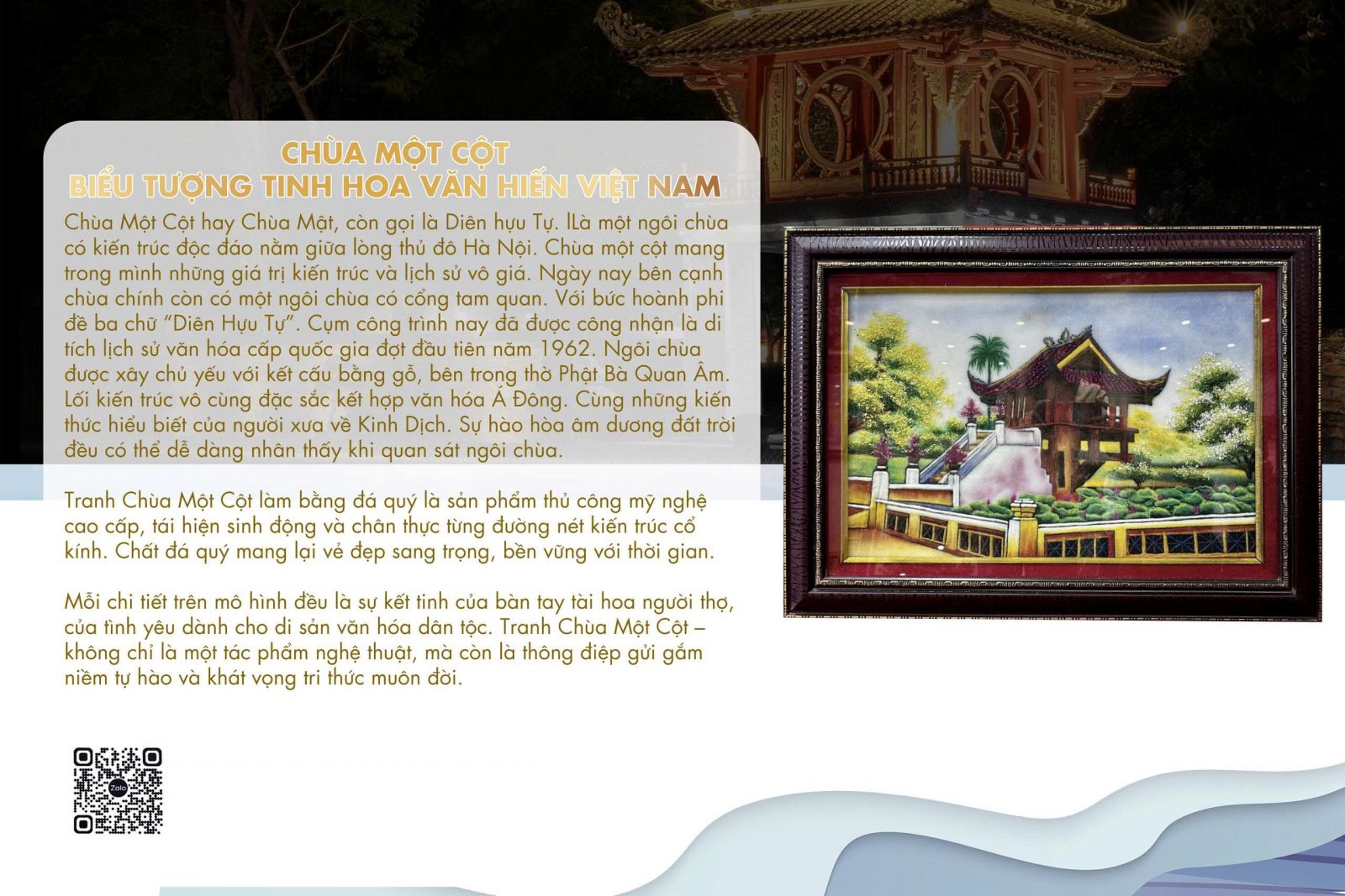 Mỗi bức tranh Chùa Một Cột bằng đá quý không chỉ là sự kết tinh giữa đá quý thiên nhiên và đôi bàn tay tài hoa của nghệ nhân, mà còn là thông điệp gửi gắm về sự trường tồn, niềm tin và khát vọng của dân tộc. Đây là sự hòa quyện hoàn hảo giữa nghệ thuật, văn hóa và tâm linh, mang đến cho người thưởng thức trải nghiệm vừa thẩm mỹ, vừa tinh thần.