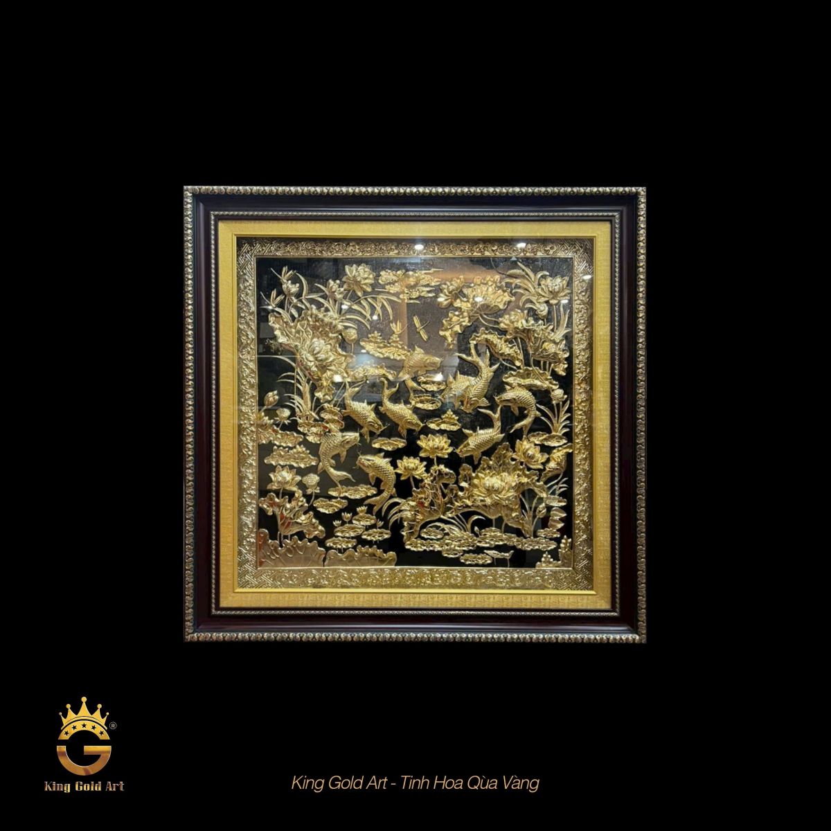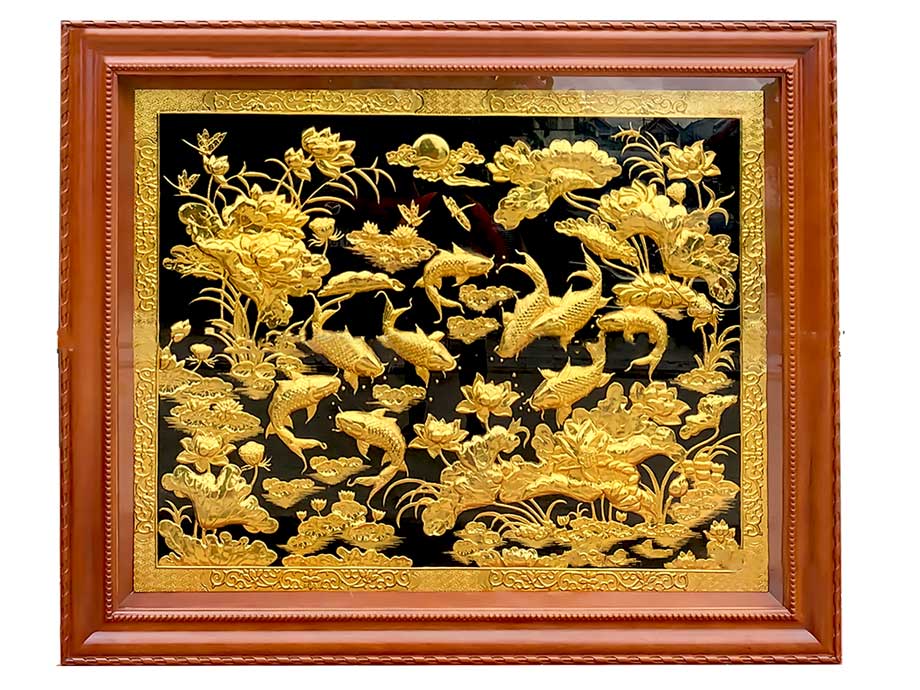 Không chỉ mang ý nghĩa phong thủy, tranh Cửu Ngư Quần Hội King Gold Art còn được chế tác công phu từ đồng vàng nguyên tấm, mạ vàng 24K lấp lánh. Mỗi chi tiết được các nghệ nhân thực hiện tỉ mỉ bằng tay, từ những vảy cá sống động đến cánh sen mềm mại, khiến tổng thể bức tranh trở nên sinh động và chân thực như một bức tranh sống.