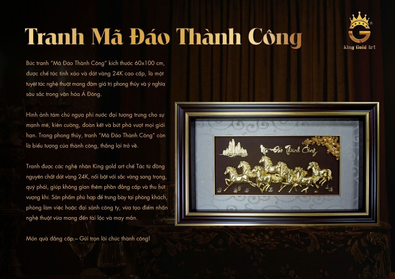 Sở hữu một bức tranh Mã đáo thành công bằng đồng không chỉ là sở hữu một tác phẩm nghệ thuật, mà là đầu tư cho vận khí của ngôi nhà và sự nghiệp. Với sự tinh xảo trong từng đường nét và chiều sâu trong ý nghĩa phong thủy, các tác phẩm của King Gold Art chắc chắn sẽ mang lại sự hài lòng và thịnh vượng cho quý khách.
