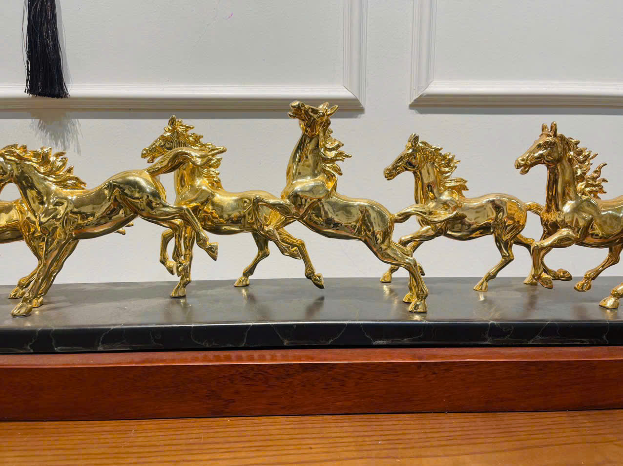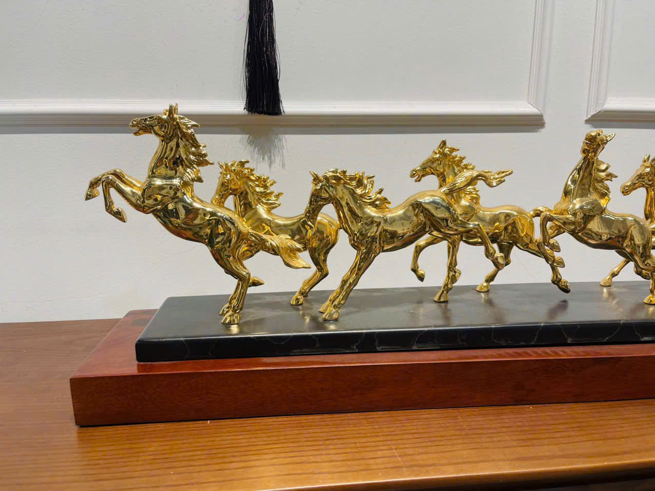 Với chiều dài lên tới 1m, tác phẩm tạo ra sự bề thế và uy nghiêm tuyệt đối khi đặt trong những không gian rộng lớn như sảnh tòa nhà, phòng khách biệt thự hay phòng làm việc của sếp tổng. Từng chú ngựa được sắp xếp bố cục lớp lang, tạo cảm giác chuyển động sống động như thật.