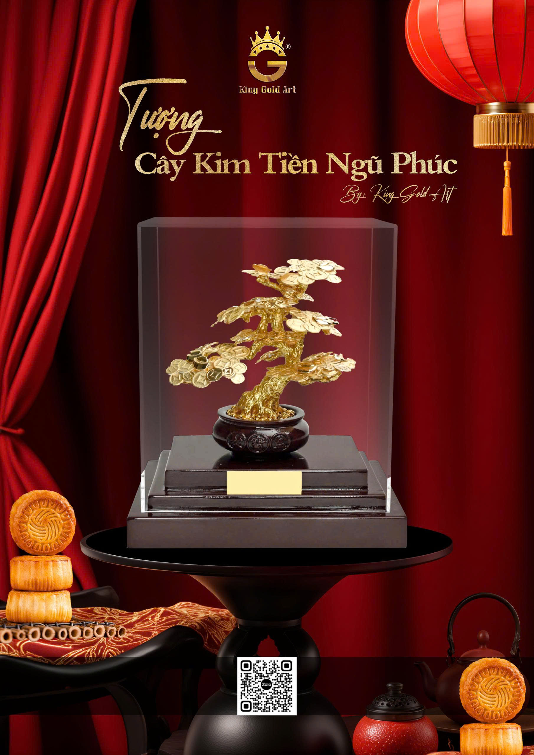 Trong bộ sưu tập quà tặng vàng Trung Thu của King Gold Art, nổi bật là Tượng Cây Kim Tiền Ngũ Phúc dát vàng, mang trong mình ý nghĩa “phú quý – tài lộc – thịnh vượng – an khang – trường thọ”.