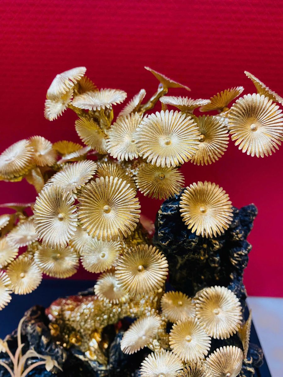 Mỗi chi tiết trên tượng cây tùng bằng đồng mạ vàng 24K đều được các nghệ nhân lành nghề của King Gold Art thực hiện thủ công một cách tỉ mỉ. Từ những tán lá xòe tròn như những bông hoa cúc vàng rực rỡ, đến thân cây uốn lượn, xù xì đầy uy dũng, và đặc biệt là khối đá trầm tích đen tuyền tạo thành bệ đỡ vững chãi – tất cả đều được chạm khắc, đúc tạo với độ chính xác và tính nghệ thuật cao. Sự tương phản giữa màu vàng rực rỡ của thân tùng, cành lá và màu đen nhám, sần sùi của khối đá không chỉ tạo nên sự hài hòa về thị giác mà còn tượng trưng cho sự cân bằng âm dương, sự vững vàng trước mọi thử thách. Tác phẩm không đơn thuần là một sản phẩm trang trí, mà là một công trình nghệ thuật điêu khắc chứa đựng tâm huyết và kỹ năng đỉnh cao.