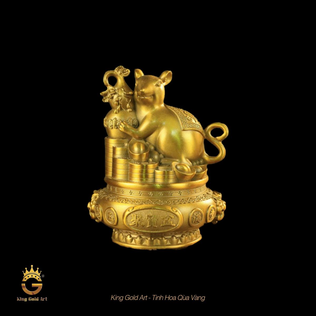 Hình ảnh chuột ngồi trên đống tiền vàng, cạnh bên là hũ vàng và thỏi vàng mang đến ý nghĩa chiêu tài tụ lộc, vượng khí cho gia chủ. Đây là thiết kế độc quyền từ King Gold Art – thương hiệu chuyên về quà tặng phong thủy cao cấp.