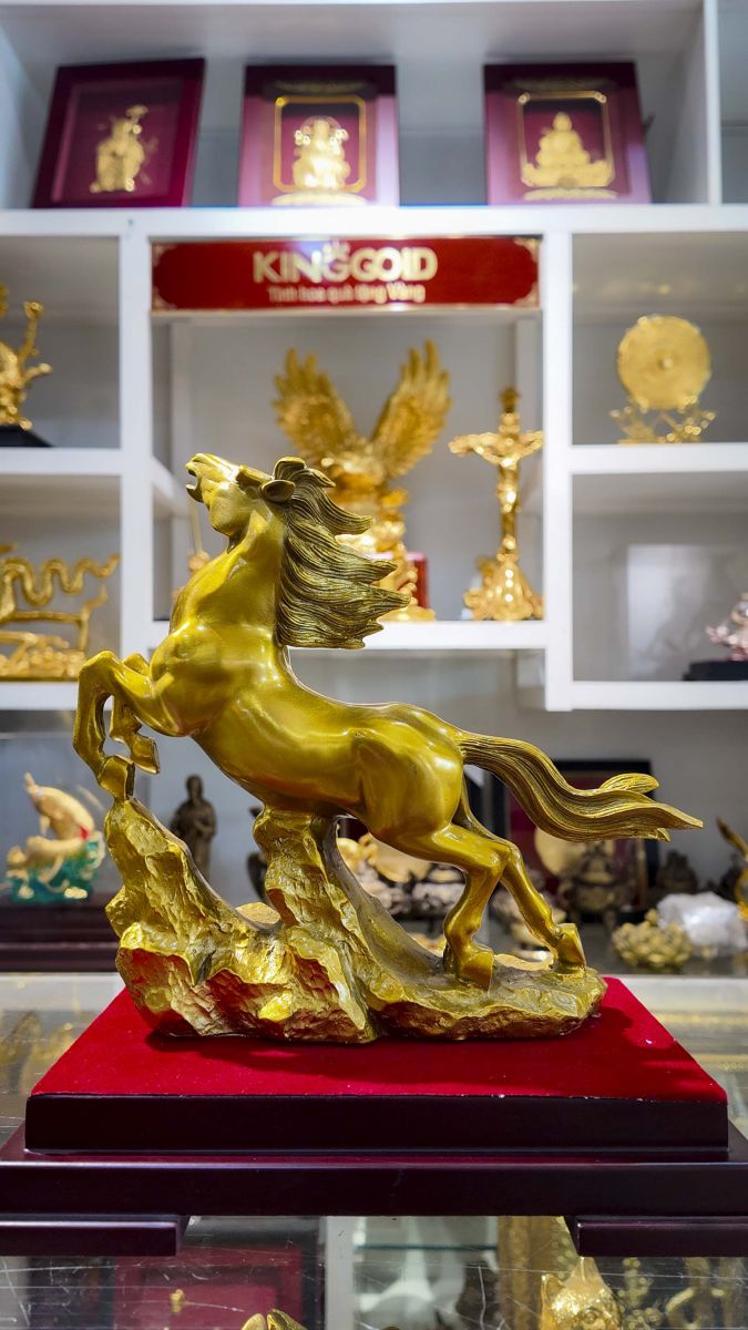 Tác phẩm được đặt trên bệ gỗ chắc chắn, nền nhung đỏ sang trọng giúp làm nổi bật sắc vàng rực rỡ của tượng ngựa. Sự kết hợp này không chỉ nâng tầm giá trị thẩm mỹ mà còn góp phần làm tăng vượng khí cho không gian trưng bày.