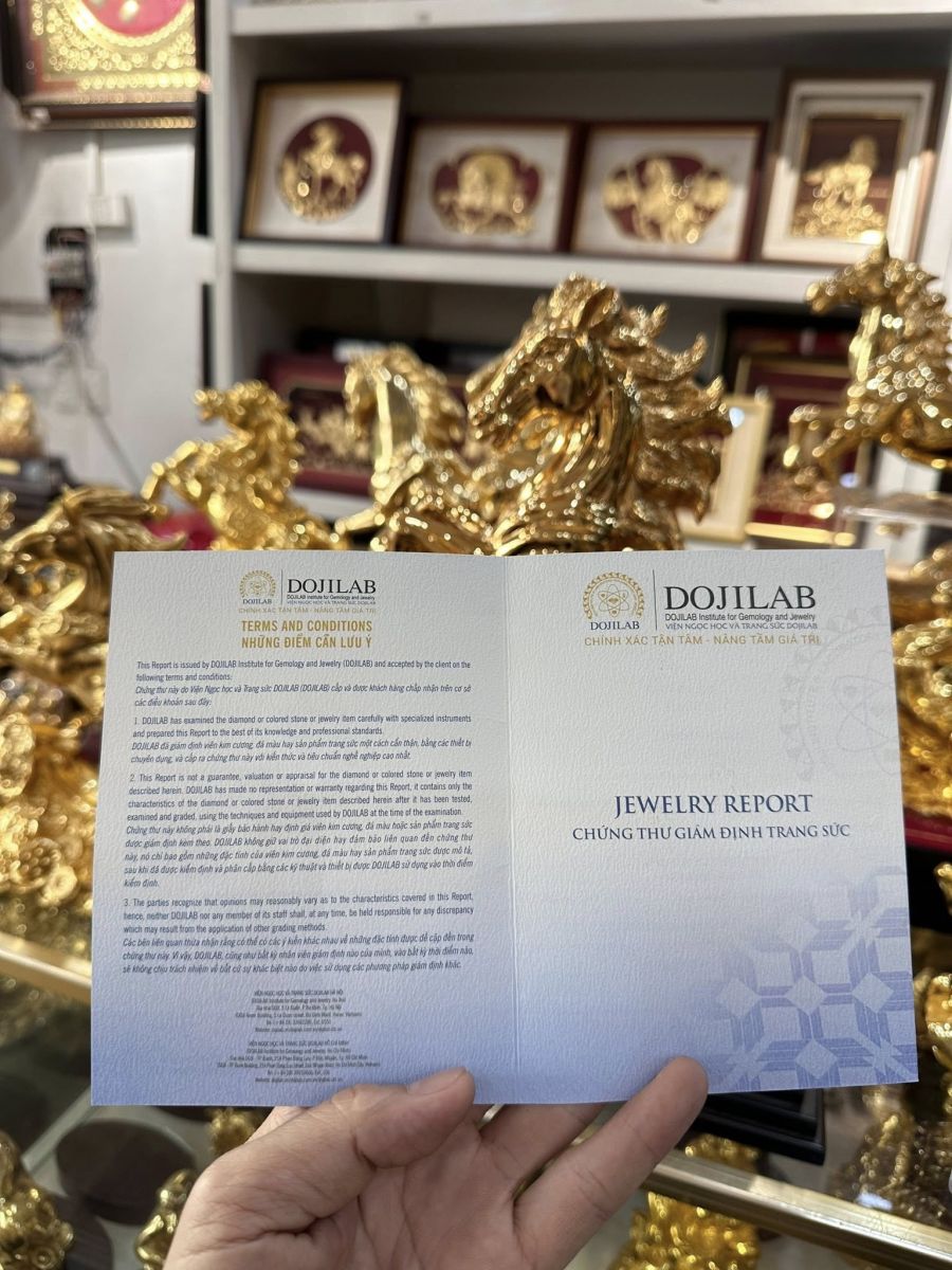 Trong bối cảnh thị trường xuất hiện nhiều sản phẩm gắn mác “mạ vàng” nhưng không rõ hàm lượng, giấy chứng nhận kiểm định vàng do DOJILAB cấp đóng vai trò như một “chứng thư pháp lý” khẳng định chất lượng. Chứng nhận này ghi nhận rõ ràng về thành phần kim loại, lớp mạ vàng và phương pháp kiểm định khoa học.