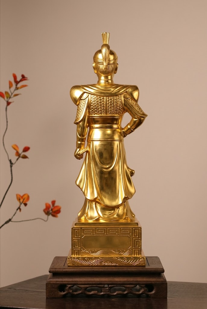 Phần bề mặt được xử lý mạ vàng 24k cao cấp, không chỉ tạo nên vẻ đẹp sang trọng mà còn giúp tăng độ bền, chống oxy hóa theo thời gian. Ánh vàng phản chiếu tinh tế, không quá chói lóa nhưng đủ để làm nổi bật khí chất uy nghi của nữ tướng.